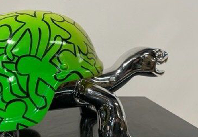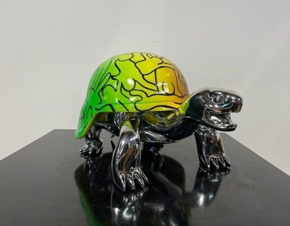 Les tortues sont réalisées en chrome argenté sur lesquelles repose un casque coloré et contemporain.